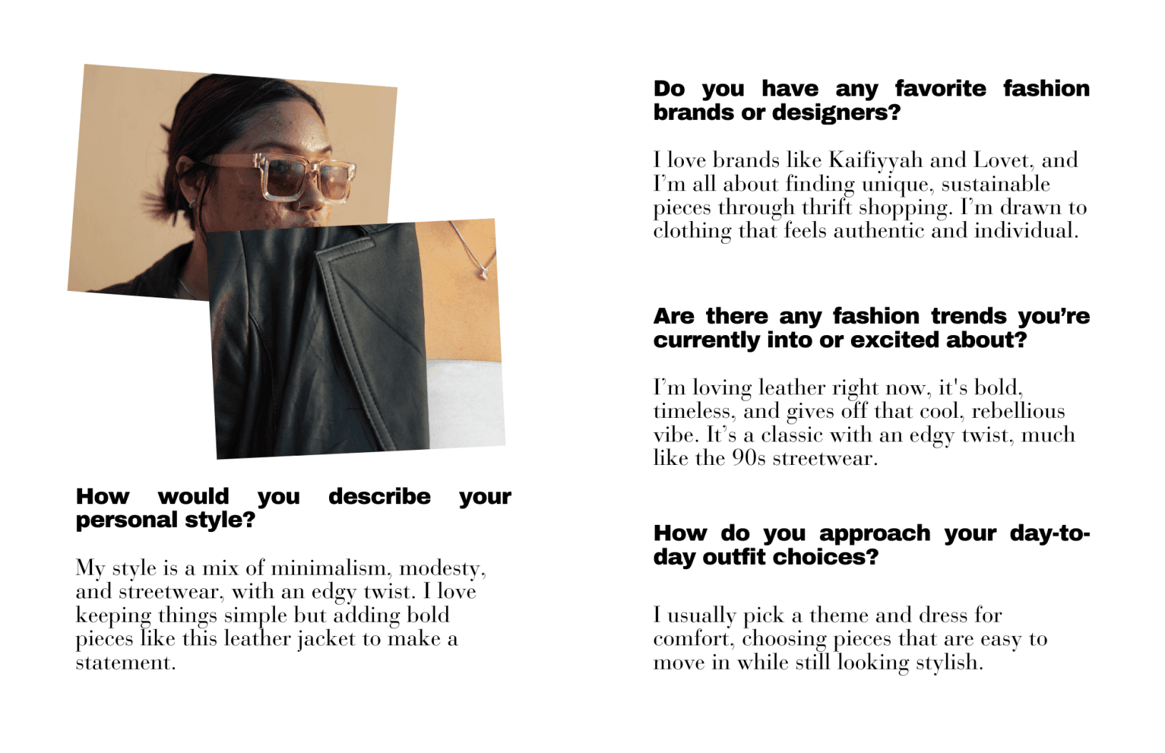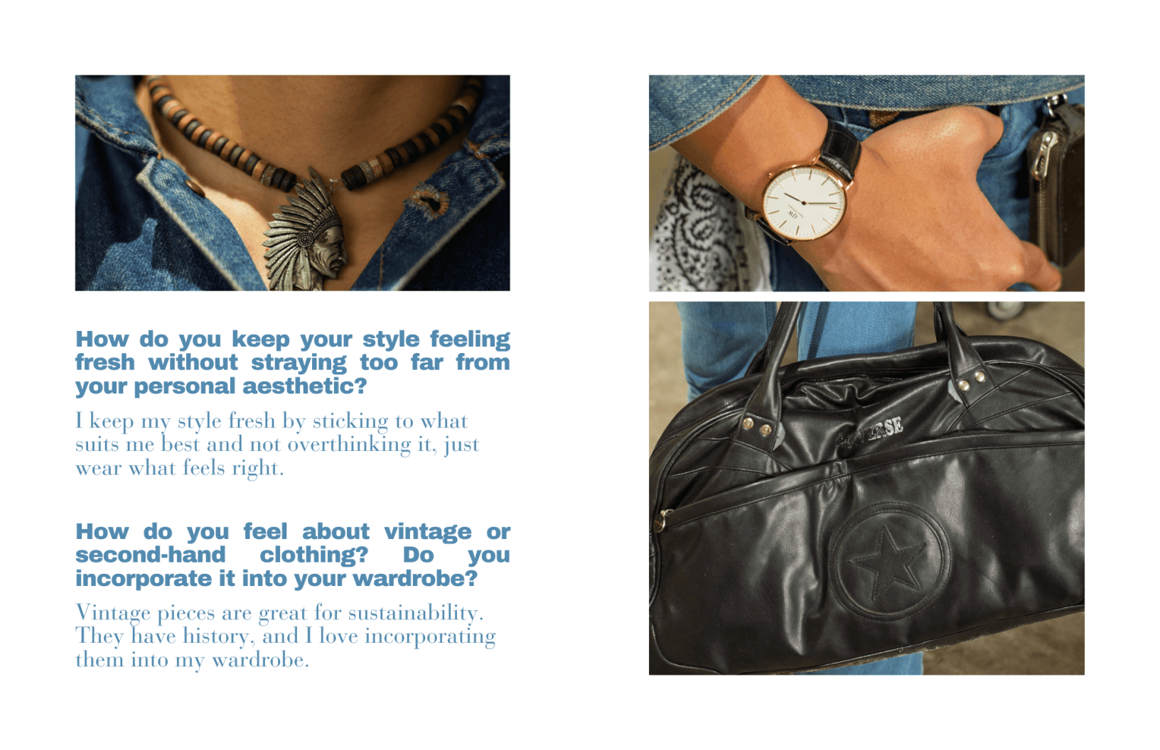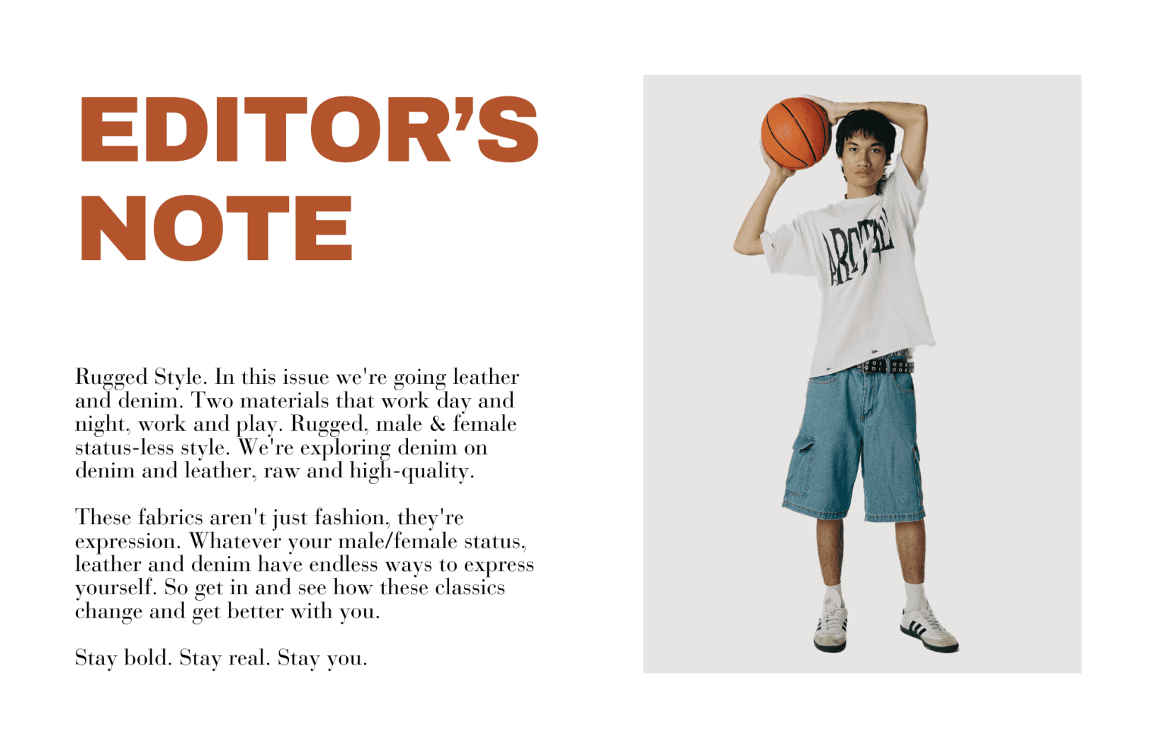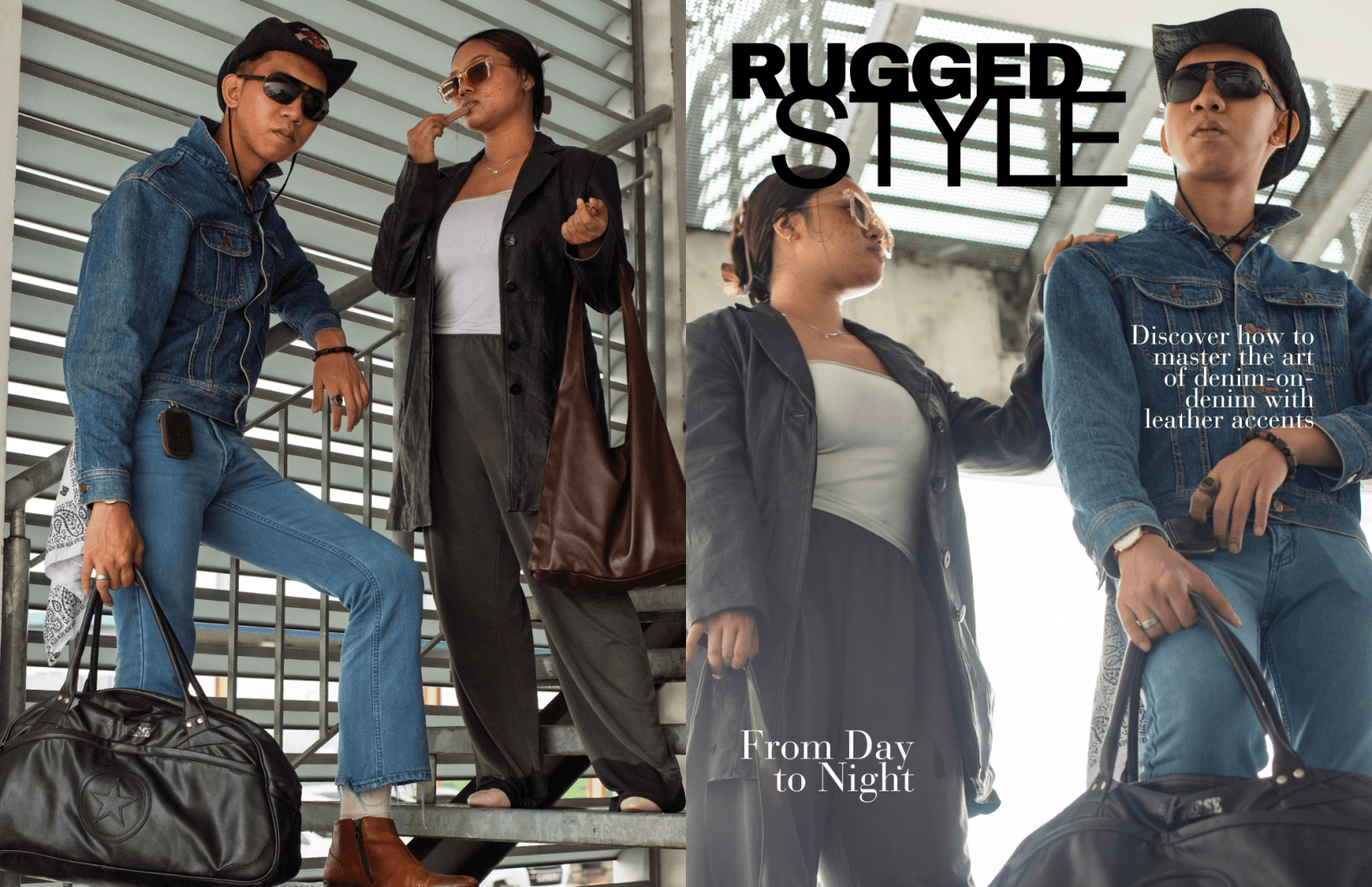 Rugged Style is a 17-page digital magazine about leather and denim-on-denim, with pages that ask questions about how the models got their style. I styled and shot two looks, a leather jacket look and a denim jacket + jeans look. I used accessories like glasses, bags, and boots/shoes to push the rugged biker-street-western vibe. I also added two GIF pages with close-ups to support the aesthetic. I used natural light and kept the editing neutral.