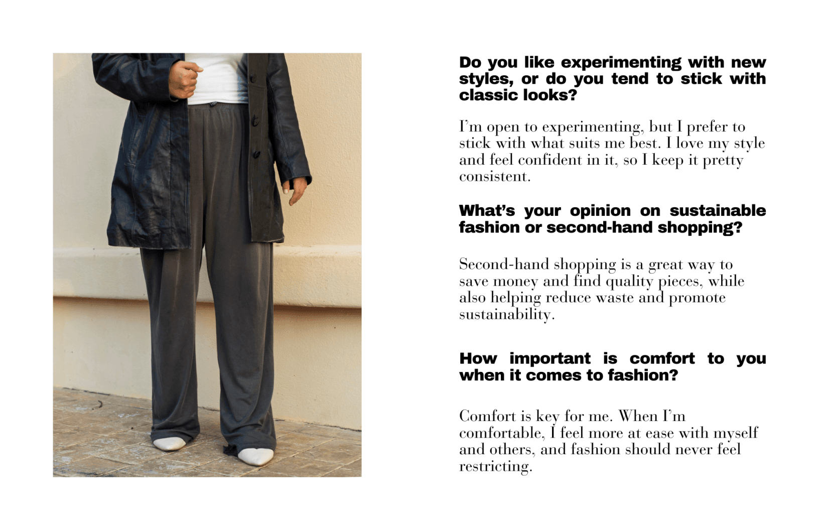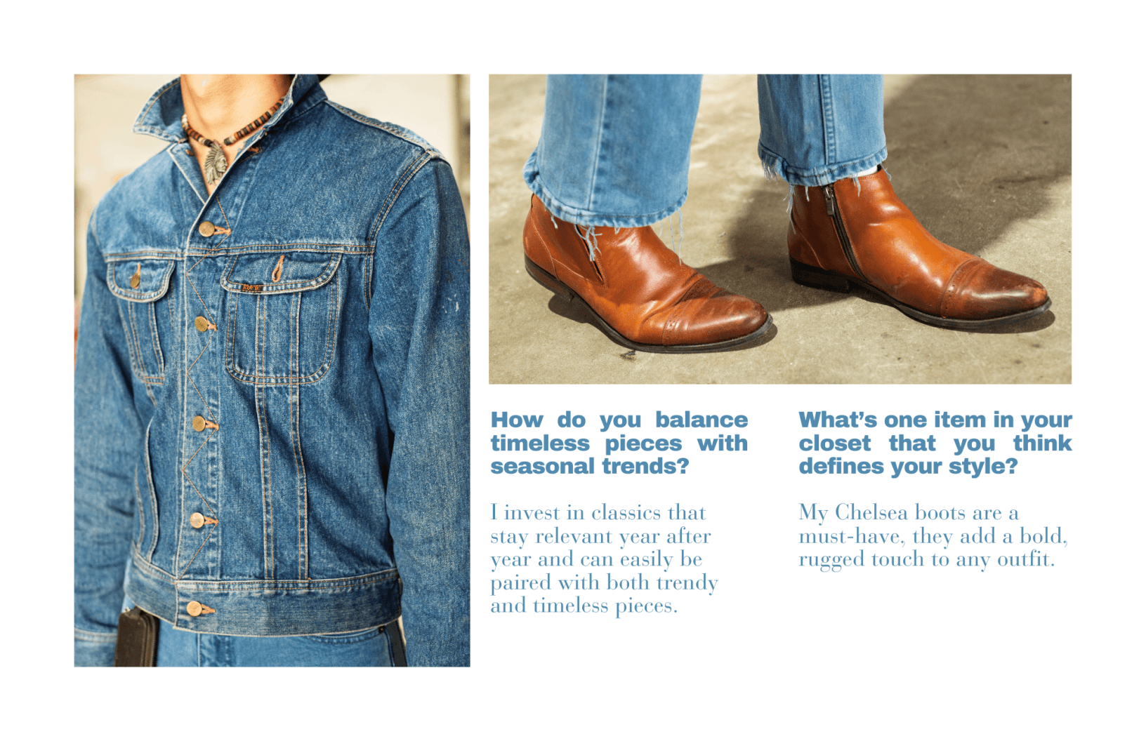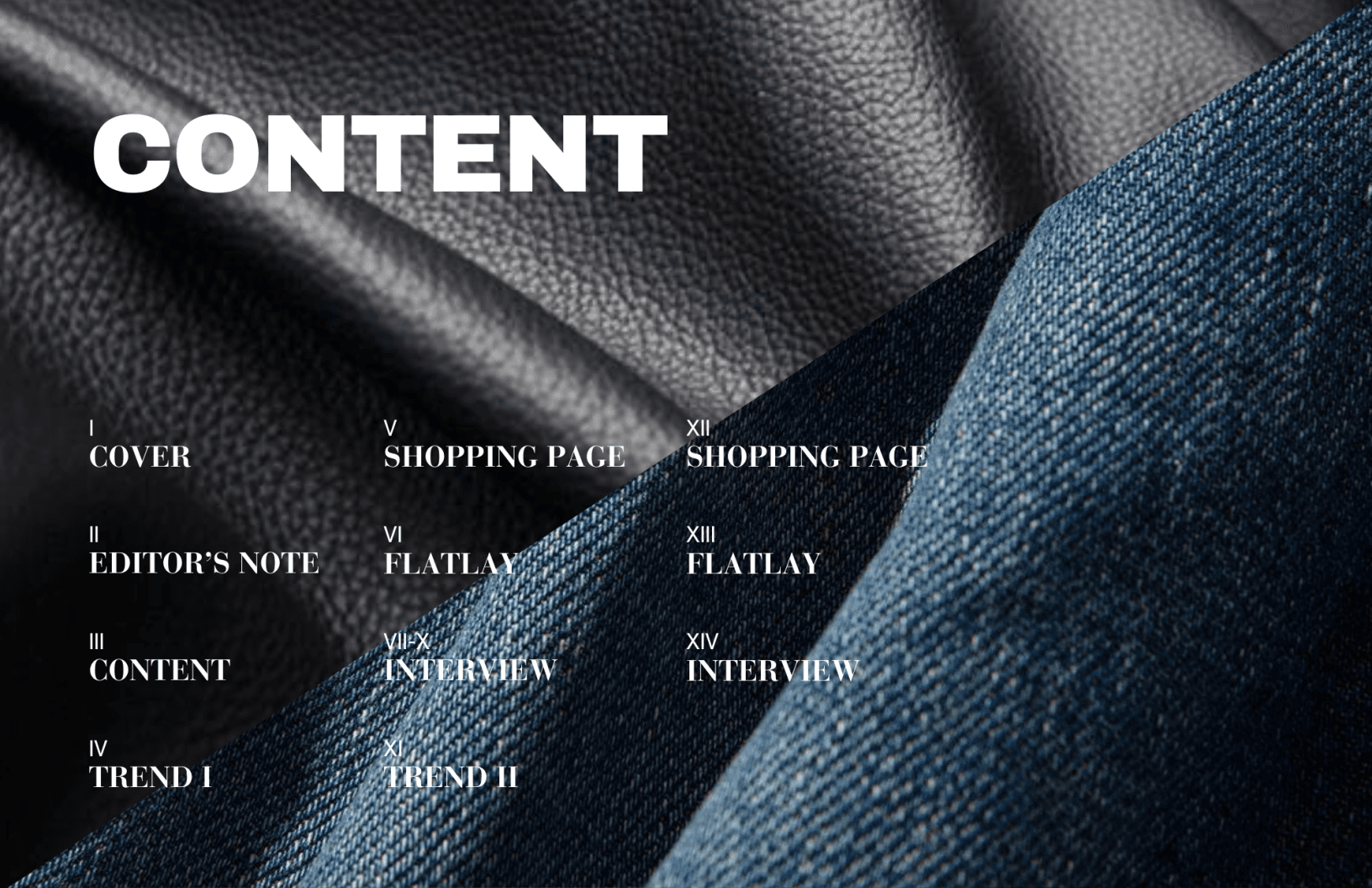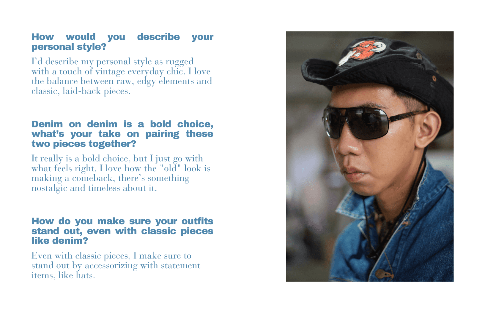 Rugged Style is a 17-page digital magazine about leather and denim-on-denim, with pages that ask questions about how the models got their style. I styled and shot two looks, a leather jacket look and a denim jacket + jeans look. I used accessories like glasses, bags, and boots/shoes to push the rugged biker-street-western vibe. I also added two GIF pages with close-ups to support the aesthetic. I used natural light and kept the editing neutral.